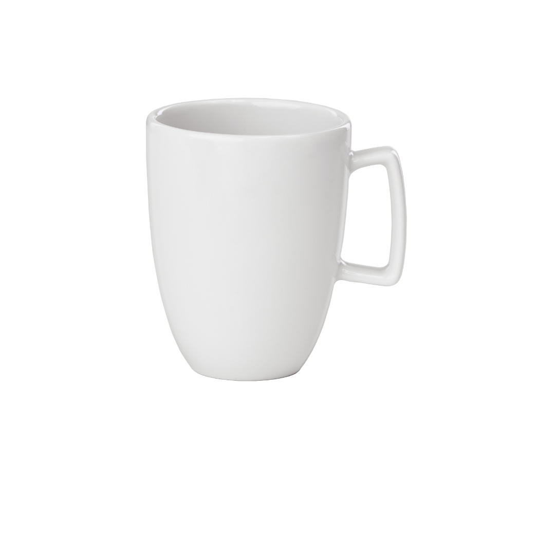 A thick-walled porcelain mug admired for its durability and elegance. Its unique, designer handle adds character while ensuring comfortable use. This mug combines refined style with functionality, perfectly fitting into any interior.